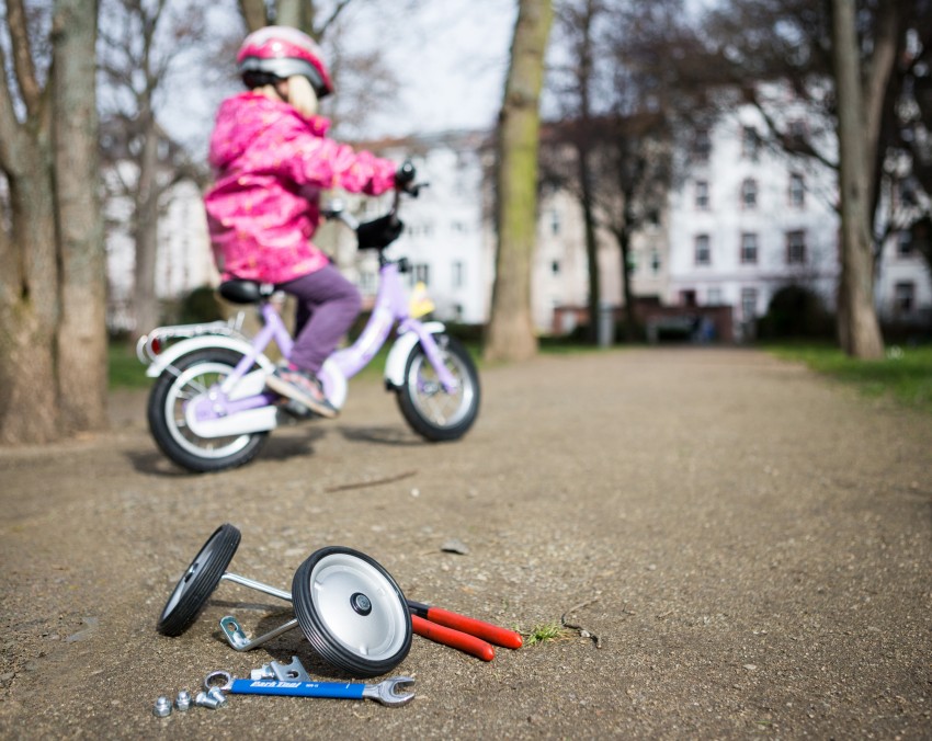 Die Knirpse können die Balance halten und Kurven fahren. Was sie lernen müssen: pedalieren, bremsen, Entfernungen und Geschwindigkeiten einschätzen und sich im Verkehr orientieren. Dabei helfen die Stützräder aber auch nicht. Das ist ein jahrelanger Prozess, den die Eltern geduldig begleiten müssen.