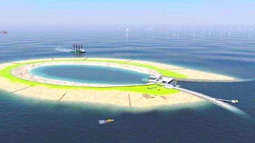 Wenn viel Wind weht – es aber an Nachfrage fehlt – soll Windstrom dazu genutzt werden, das Wasserreservoir in der Mitte der Insel leerzupumpen. Wenn die Nachfrage nach Strom wieder groß ist, werden die Schleusen geöffnet. Das Wasser strömt dann in das ausgebuddelte Inselinnere und treibt dabei Turbinen an, die Strom erzeugen.