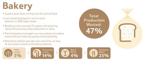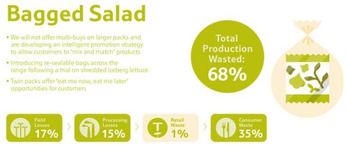 Tesco hat die 25 am häufigsten verkauften Produkte aus seiner Lebensmittelabteilung über die komplette Lebenszeit analysierst, vom Anbau über die Verarbeitung bis zum Verbraucher. Bei Salat ist das Ergebnis besonders beeindruckend: 68 Prozent gehen insgesamt verloren. Mehr als zwei Drittel aller Salate werden also weggeschmissen: 17 Prozent sind es im Anbau, 15 Prozent in der Verarbeitung, ein Prozent im Verkauf – und eben 35 Prozent in der Küche des Verbrauchers.