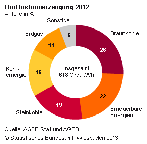 Frisch vom Markt: Neueste Zahlen vom Statistischen Bundesamt zum Strommix in Deutschland. Braunkohle ist immer noch der wichtigste Energielieferant, gefolgt von den Erneuerbaren Energien. Im Jahr 2010 lag der Kernenergieanteil noch bei 22,4 Prozent, jetzt sind es 16,1 Prozent. Der Atomausstieg (beziehungsweise die Energiewende) klappt also. Der Ökostromanteil Ist nur leider mühsamer als gedacht.
