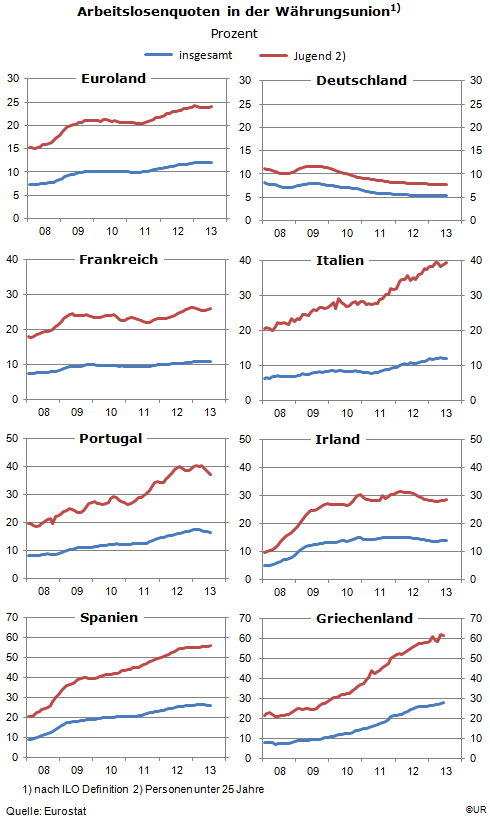 Der Euro könnte angesichts der Depressionen in den Krisenländern auf der Strecke bleiben, nicht nur weil deren Staatsschulden nach wie vor steigen und ein gefährliches Niveau erreicht haben, sondern weil dort zwischen 12 und 28 Prozent der Leute arbeitslos sind, ohne dass Besserung in Sicht ist. Vor allem die Jungen sind betroffen. Insgesamt haben wir es mit einer sozialen Katastrophe zu tun.