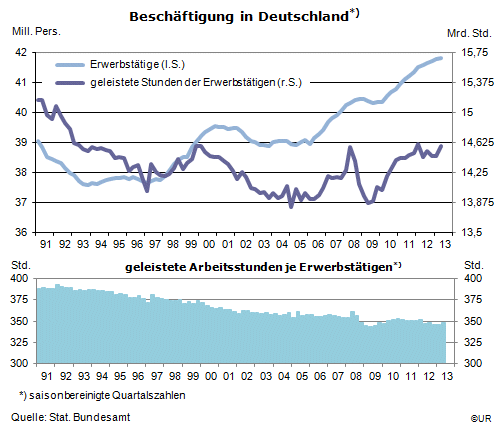 Bei der Beschäftigung sieht es nach wie vor ganz gut aus, aber wer die Daten genauer unter die Lupe nimmt, erkennt rasch, dass ihre Zunahme erkauft wird durch einen Rückgang der durchschnittlichen Arbeitszeit: Immer mehr Leute arbeiten immer weniger. Wenn das auf freiwilliger Basis geschähe, würde ich mich freuen – es könnte ein Zeichen zunehmenden Wohlstands sein. Ich habe da aber meine Zweifel. Mindestens ebenso plausibel ist, dass sich die Schere zwischen Gutverdienern und Leuten, die knapp am Existenzminimum leben und Teilzeit arbeiten müssen, ständig weiter öffnet. Wer früher arbeitslos gewesen wäre, ist heute gezwungen, sich mit schlecht bezahlten Jobs durchzuschlagen.