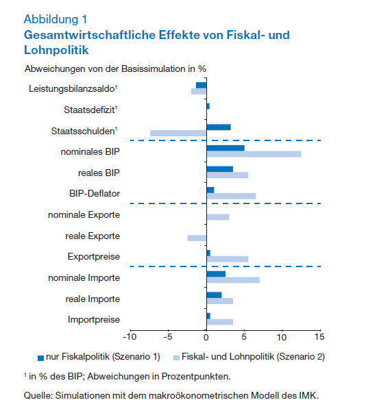 Anders verhält es sich in Szenario 2. Die Kombination aus Fiskal- und Lohnpolitik hat im Vergleich zur Basissimulation weder einen positiven noch einen negativen Effekt auf die Defizitquote und einen deutlich positiven Effekt auf die Schuldenquote, die um 7,4 Prozentpunkte sinkt. Die Erklärung hierfür sehen die Autoren in der höheren Dynamik der Binnenkonjunktur aufgrund steigender Löhne und Einkommen der privaten Haushalte. So nehmen die Beschäftigung und das reale BIP deutlich stärker zu als in Szenario 1, ebenso wie die Einnahmen des Staats und das nominale BIP, das noch zusätzlich durch einen stärkeren Preisanstieg getrieben wird.