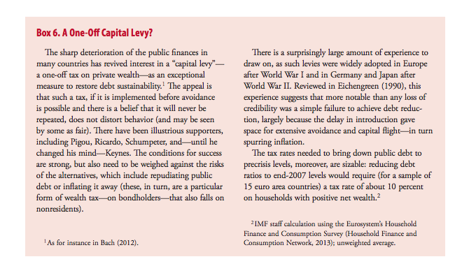 Der IWF schlägt allen Ernstes eine Vermögensabgabe in Höhe von 10 Prozent für alle Besitzer von Ersparnissen, Wertpapieren und Immobilien vor, um die wuchernden Staatsschulden in der Währungsunion ein bisschen abzutragen.