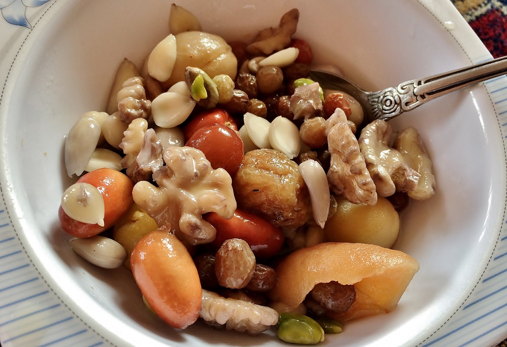 „Haft Mewa“ – eine Obstspeise, die am letzten Abend des Jahres zubereitet wird. „Haft mewa“ heißt „sieben Früchte“: helle und dunkle Rosinen, Mandeln, Walnüsse, Aprikosen, Datteln und Pistazien. Alles wird in Wasser aufgekocht und über Nacht eingeweicht.