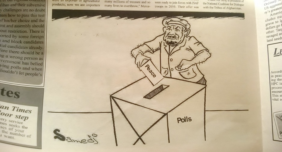 Jeden Morgen, außer freitags, lese ich zum Frühstück in der „Afghanistan Times“. Das macht nicht gerade gute Laune – wären da nicht Samedi und seine kleinen Zeichnungen. Auch heute, am Tag nach dem offiziellen Start der Wahlkampf-Kampagnen fand ich sie sehr gelungen.