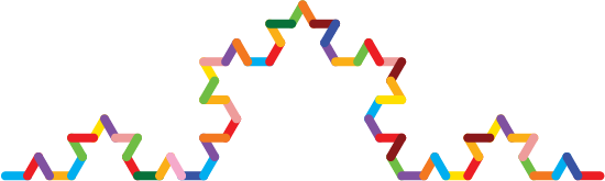Geht man die Thue-Morse-Folge durch und biegt um 120 Grad nach links ab, wenn zwei aufeinanderfolgende Ziffern ungleich sind, und um 60 Grad nach rechts, wenn sie gleich sind, so erhält man als Fraktal die Koch-Kurve: Die Ausgangssituation ist ein einziges Streckenstück K(0). Und für jede natürliche Zahl n entsteht die Figur K(n+1) aus K(n) indem in jedem Linienstück das mittlere Drittel durch zwei Schenkel eines nach oben gerichteten gleichseitigen Dreiecks ersetzt wird. Setzt man diese Vorgehensweise unendlich fort, entsteht die Koch-Kurve. Hier ist eine Bauanleitung fürs Making-of : Die Linienzüge K(0), K(1), K(2), K(3) auf dem Weg zur Koch-Kurve: