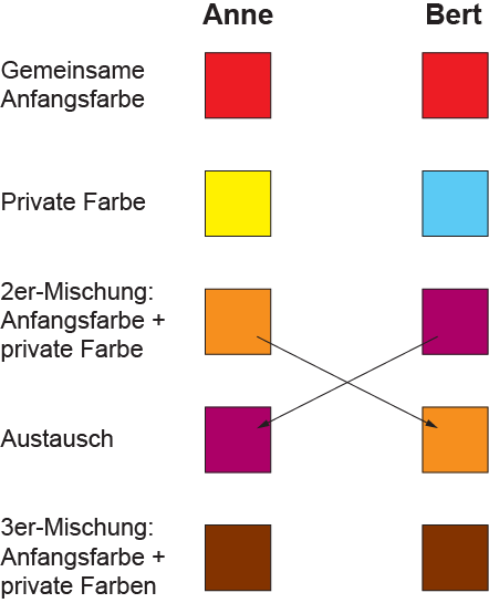 Zunächst einigen sich die Partner Anne und Bert auf eine Anfangsfarbe (sagen wir: rot). Die kann durchaus öffentlich bekannt werden. Dann wählen beide je eine private Farbe (Anne: gelb, Bert: blau) und mischen diese mit der Anfangsfarbe (ergibt bei Anne orange, bei Bert lila).