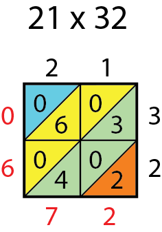 Die Produkte werden zweistellig in die Kästchen eingetragen, wobei die Zehnerstelle, eventuell 0, in der oberen Hälfte steht. Anschließend werden rechts beginnend die Ziffern in jeder Diagonalen addiert.