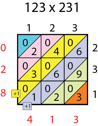 Ergibt sich bei der Summenbildung in den Diagonalen eine zweistellige Zahl, so wird nur deren Einerstelle als Ziffer der Lösung notiert und ihre Zehnerstelle zur Summe in der nächsten Diagonalen hinzuaddiert. Das sieht man am Beispiel 123 x 231.