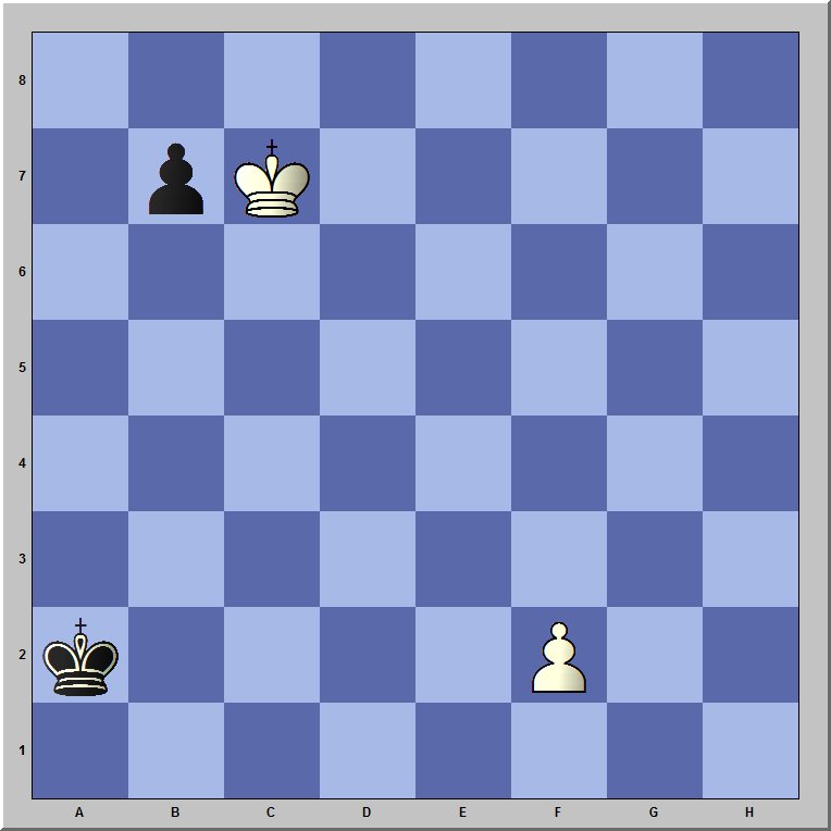 Der schwarze König kann den weißen Bauern leicht von der Umwandlung in eine Dame hindern. Er steht ja nicht weit von ihm entfernt. Umgekehrt steht der weiße König aber weit vom schwarzen Bauern entfernt, der drei Felder Vorsprung hat für den Lauf nach h1, wo er sich in eine Dame umwandeln kann.