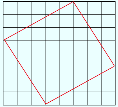Im unteren Diagramm sind dieselben vier Dreiecke anders positioniert. Die Fläche des Schachbretts, die sie nicht abdecken, ist die Fläche des großen Quadrates in der Mitte. Diese Fläche ist c2. Dieses Quadrat ist also genauso groß wie die beiden kleinen Quadrate im ersten Diagramm. Und fertig ist der Schachbrett-Beweis des Satzes von Pythagoras für das gegebene, aber beliebige rechtwinklige Dreieck.