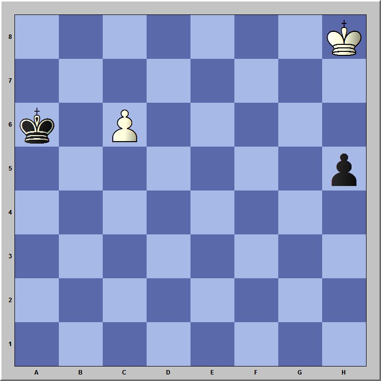Aber der Schein trügt. Die Rettung wird möglich durch die kuriose Geometrie des Schachbretts. Und zwar mit dem Manöver 1.Kg7 h4 2. Kf6 Kb6. Wenn an dieser Stelle Schwarz den Bauern nach h3 gezogen hätte, dann könnte der weiße König seinen eigenen Bauern schützen und ihm helfen, sich in eine Dame umzuwandeln. Das geht so: 3.Ke7 h2 4. c7 Kb7 5. Kd7 und mit den nächsten beiden Zügen von Schwarz und Weiß entstehen zwei Damen auf dem Brett, so dass die Stellung Remis ist.