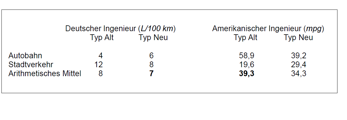 Nehmen wir nun einmal an, ein deutscher und ein amerikanischer Ingenieur wollen die Wirtschaftlichkeit zweier Fahrzeugtypen Alt und Neu vergleichen. Die beiden Ingenieure testen jeweils ein Fahrzeug vom Typ Alt und eines vom Typ Neu im Stadtverkehr und auf der Autobahn – unter gleichen Bedingungen. Ihren Verbrauch erfassen die Ingenieure in den ihnen vertrauten Einheiten: