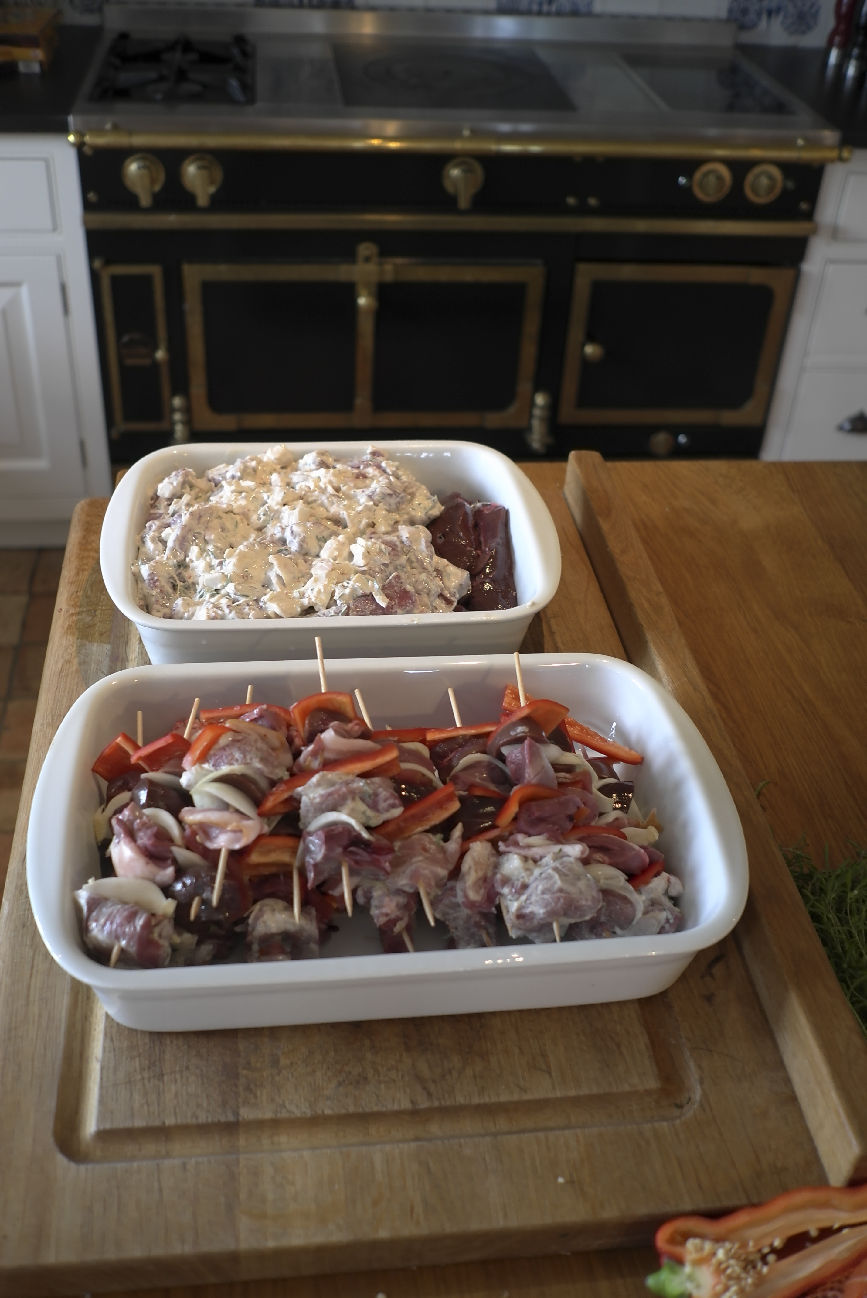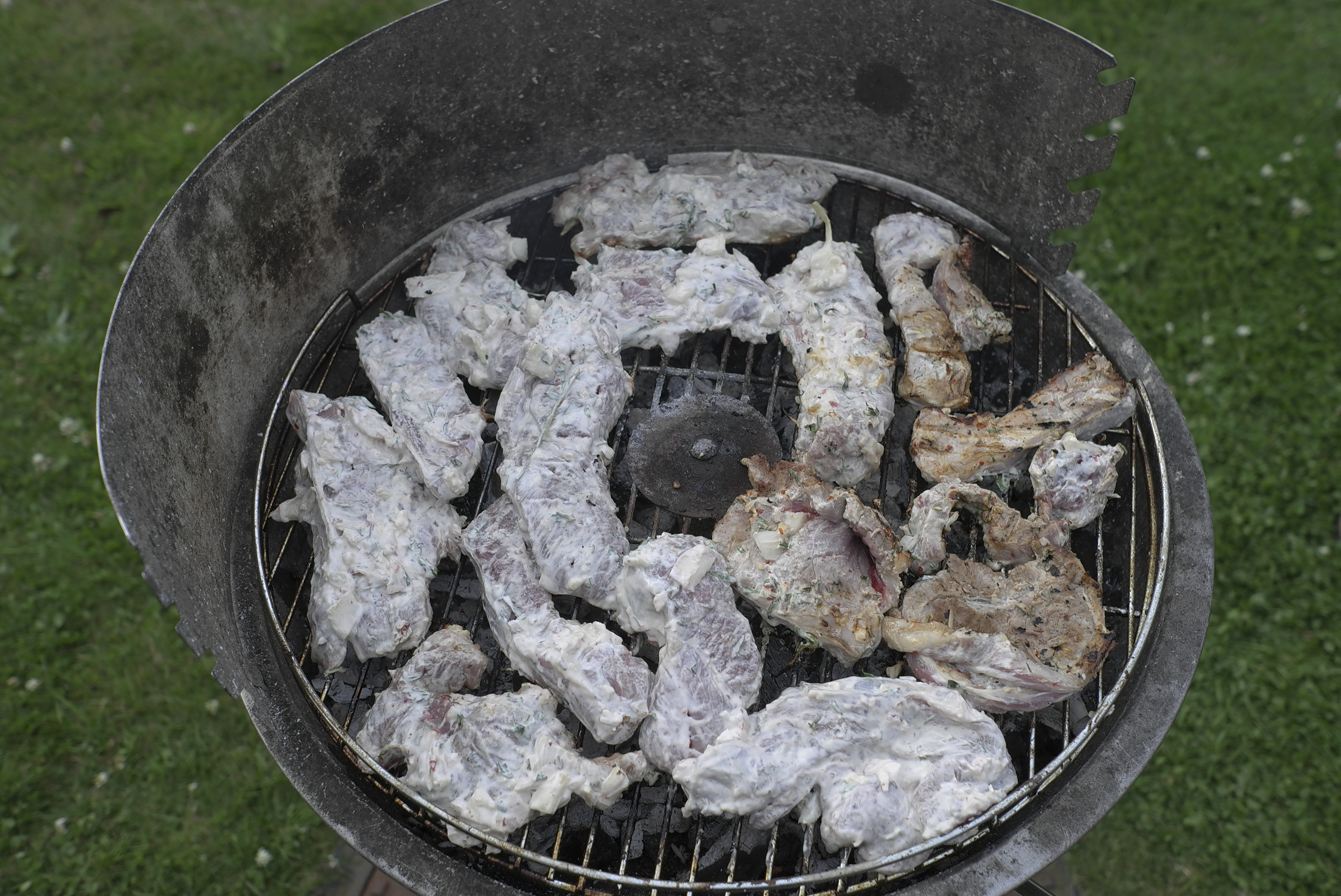 Der wöchentliche Rhythmus, in dem Helge Dethlefsen aus Nebel seine Lämmer schlachtet, kommt mir sehr entgegen. So kann ich eine abgehangene, gut gereifte Lammkeule aus der Vorwoche erstehen und dazu tagesfrische Innereien. Schade, dass diese sonst nur als Hundefutter verkauft werden… Die Keule habe ich ausgelöst, zugeschnitten und alle Teile außer der Haxe in kleine Steaks von jeweils ca. 70g geschnitten. Das Fleisch ist mürbe, trocken und saftig zugleich, von marzipanartiger Struktur. Ich habe es mit griechischem Joghurt, Bohnenkraut, weißem Pfeffer, Zwiebeln und Knoblauch noch einige Stunden mariniert. Die Innereien wurden in walnussgroße Stücke geschnitten, dann mit Paprika, Zwiebeln und Speck zu kleinen Schaschliks gespießt. Beides wurde anschließend auf Holzkohle gegrillt und sorgte für manchen Zungenschnalzer.