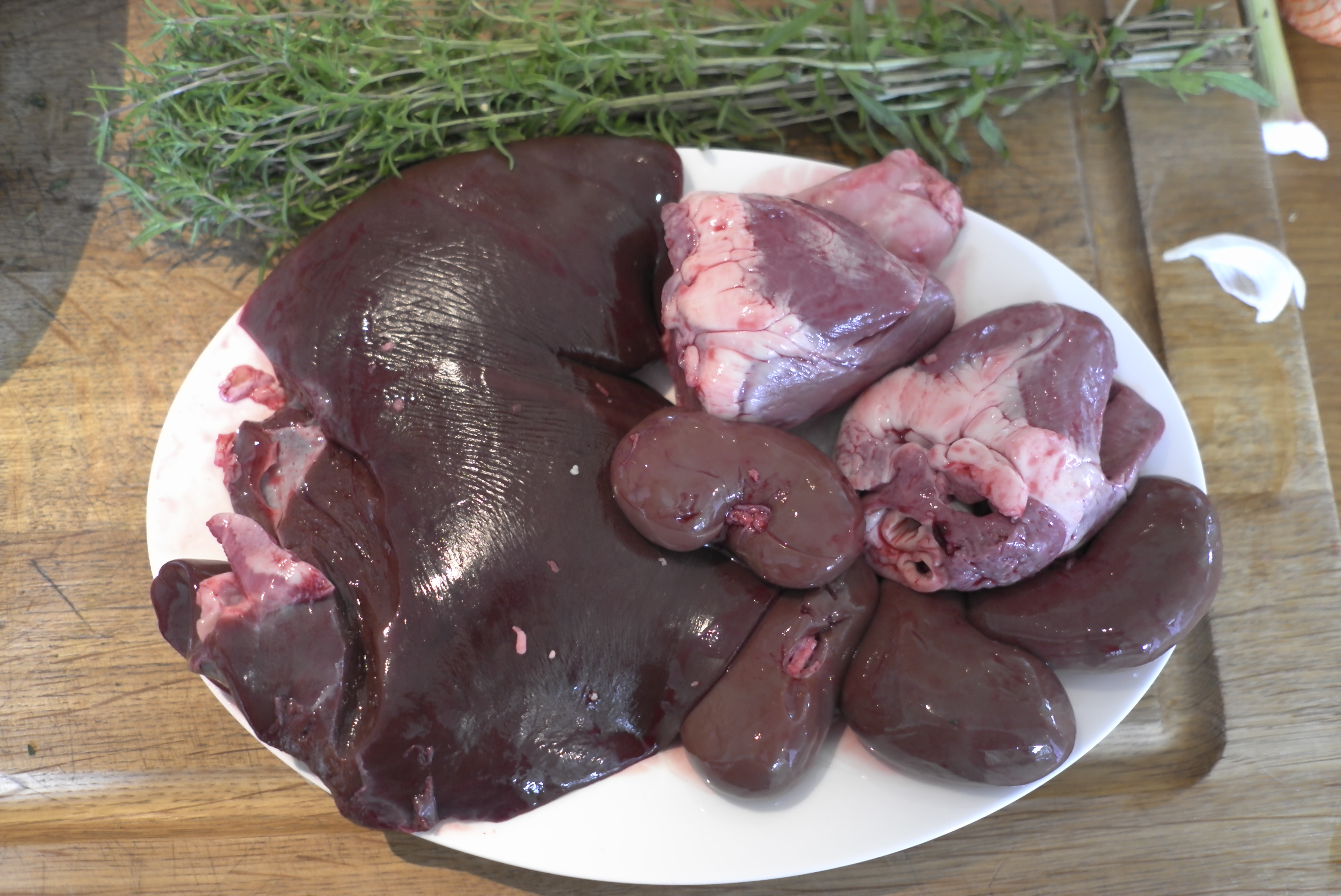Der wöchentliche Rhythmus, in dem Helge Dethlefsen aus Nebel seine Lämmer schlachtet, kommt mir sehr entgegen. So kann ich eine abgehangene, gut gereifte Lammkeule aus der Vorwoche erstehen und dazu tagesfrische Innereien. Schade, dass diese sonst nur als Hundefutter verkauft werden… Die Keule habe ich ausgelöst, zugeschnitten und alle Teile außer der Haxe in kleine Steaks von jeweils ca. 70g geschnitten. Das Fleisch ist mürbe, trocken und saftig zugleich, von marzipanartiger Struktur. Ich habe es mit griechischem Joghurt, Bohnenkraut, weißem Pfeffer, Zwiebeln und Knoblauch noch einige Stunden mariniert. Die Innereien wurden in walnussgroße Stücke geschnitten, dann mit Paprika, Zwiebeln und Speck zu kleinen Schaschliks gespießt. Beides wurde anschließend auf Holzkohle gegrillt und sorgte für manchen Zungenschnalzer.