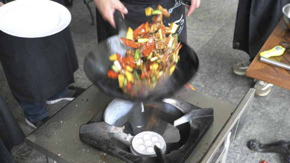 Es wurde reihum fritiert und geschwenkt, gerührt und abgeschmeckt. Es hat gezischt und geraucht und es hat wunderbar gut gerochen und geschmeckt. Zutaten wie sie aus China kommen könnten haben sich abgewechselt mit thailändischen und indischen Produkten, von Hühnchen über Rind und Fisch bis hin zu komplett vegetarischen Zusammenstellungen.