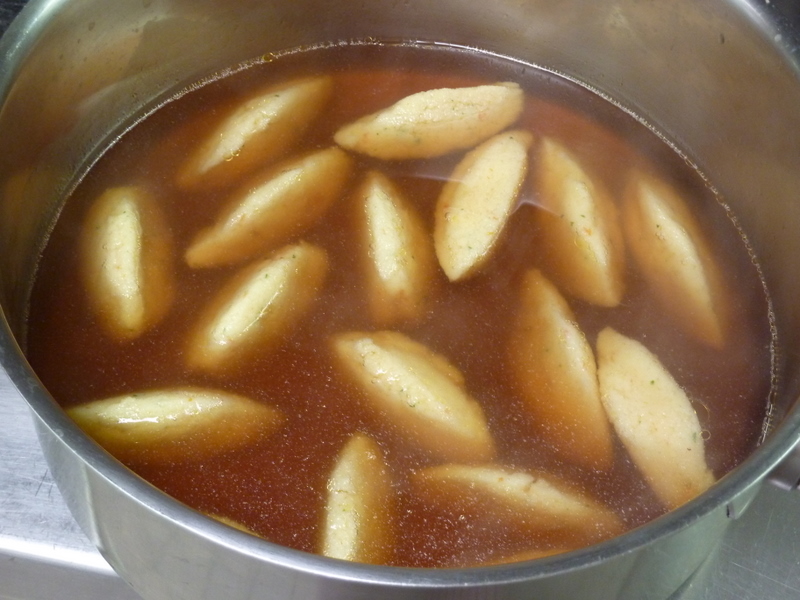 Die Butter schaumig schlagen, das Ei dazu, Grieß hinterher und mit Salz, Pfeffer und Muskat abschmecken. 25 Minuten den Grieß quellen lassen und mit gehackter Petersilie verfeinern. Nun mit zwei Löffeln und etwas Geschick schöne Nocken mit geraden Kanten abstechen, im leicht siedender Fleischbrühe 20 Minuten garen.