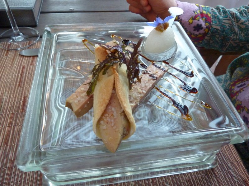 Es ging weiter mit einer kurz angebratenen Entenleber mit einem Sorbet von weißem Balsamessig im „Pollen-pain“. Weiß nicht, was das war, der Teig eher süßlich, wie eine feste Waffel, und das wurde auf einem Glasbaustein (die in den 60er Jahren in Treppenhäusern verbaut wurden) serviert.