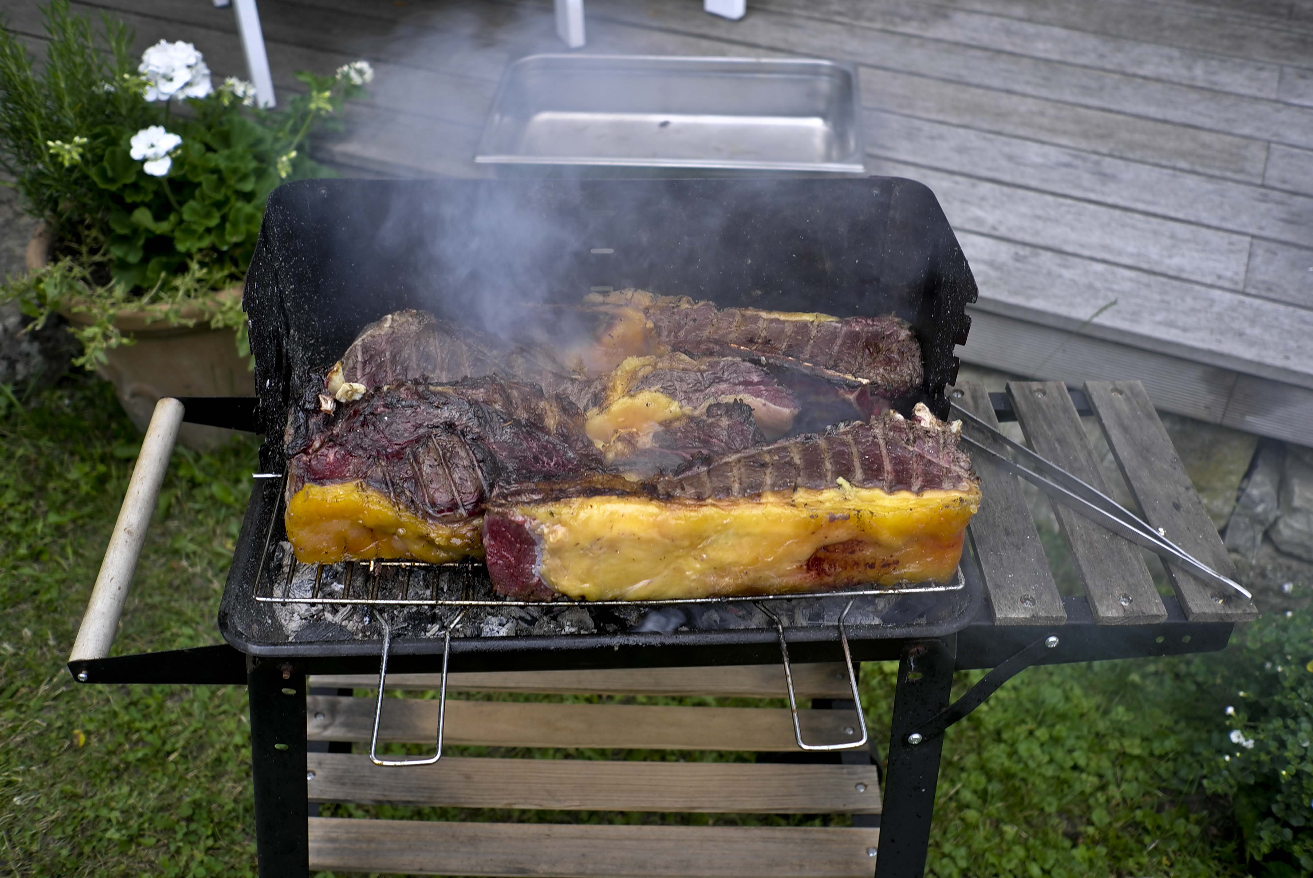 Eine ganze Stunde haben die dicken Stücke dort vor sich hingequalmt, allein schon der dichte Rauch war spektakulär, das Fett obendrauf wurde je wärmer je gelber. Noch konnte keine Rede davon sein, dass hier irgendetwas vertrauenerweckend aussah. Nur der entstehende Geruch machte neugierig. Nachdem die Hitze der Holzkohle nachgelassen hat, habe ich das Fleisch bei 120°C in den Ofen geschoben, bis es gleichmäßig perfekt 55°C im Inneren warm war.
