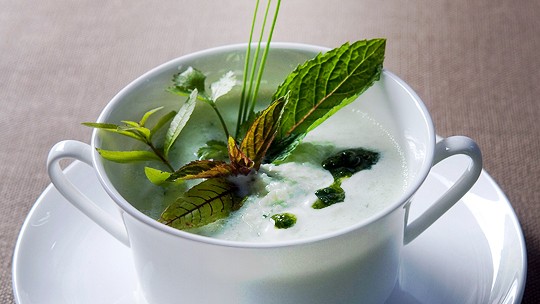 Gurke, Eis, Sauerrahm, Joghurt und Gartenkräuter in ein hohes Gefäß geben, mixen und mit Zitronensaft abschmecken. Wenn die Suppe zu dick ist, noch etwas Sauerrahm zugeben.