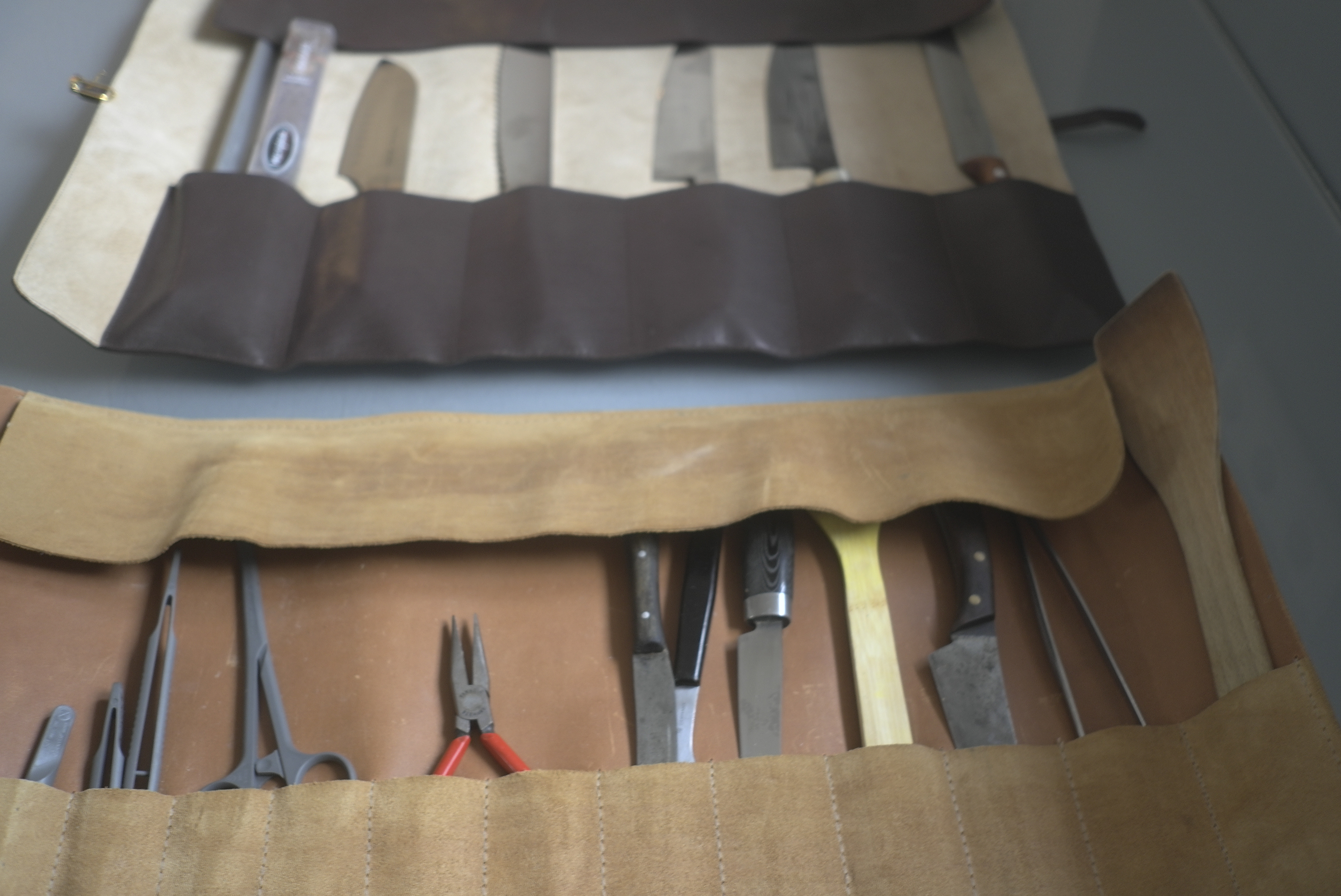 Weil die Werkzeugrolle doch schmäler ist, als meine großen Messer lang sind, habe ich mir nochmal eine entsprechend große Version aus Kalbs- und Schweineleder von einem südafrikanischen Freund anfertigen lassen. Dessen Vater hat sein Handwerk in den fünfziger Jahren in Offenbach gelernt und ist in den Siebzigern nach Afrika ausgewandert, hat dort eine Manufaktur gegründet. Heute werden bei Cape Cobra in allerbester, handwerklicher Tradition edle und hochwertige Handtaschen und andere Lederwaren gefertigt, im Auftrag für Luxusmarken und für den Verkauf in eigenen Ladengeschäften. In der Hauptsache also eigentlich eher ein Sortiment für Damen. Meine neue Werkzeugrolle ist zwar keine Handtasche, doch sie ist so schön geworden und ich habe soviel Freude daran, dass ich nun meine Frau etwas besser verstehe.
