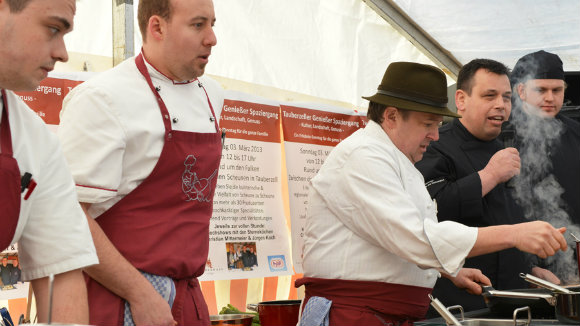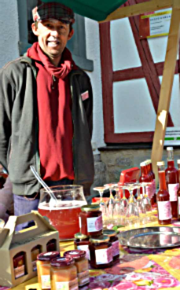 Die Vereinigung Slowfood setzt sich seit Jahren dafür ein, dass diese fleißigen Menschen sich neue Absatzmärkte erschließen können und führt bei jeder Gelegenheit Hersteller und Kunden zusammen. Lars Zwick, Jürgen Koch und ich sind Fördermitglieder von Slowfood und zusammen mit Peter Grethler konnten wir nun den 2.Tauberzeller Genießerspaziergang organisieren. Die Marktbeschicker sind langjährige Lieferanten unserer Restaurants und so machen wir auf diesem Weg unsere Gäste zu deren direkten Kunden.