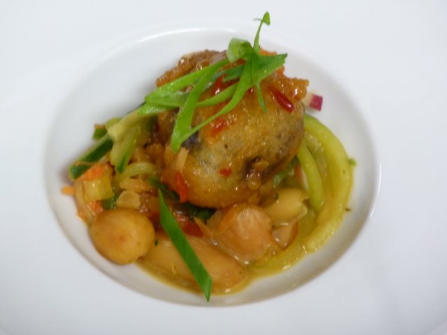 Danach wurden sie in Tempurateig in heißem Fett schön frittiert und auf einem mit Chicken-Chilli-Sauce verfeinertem Gemüse angerichtet, super Idee und super Geschmack!