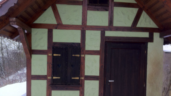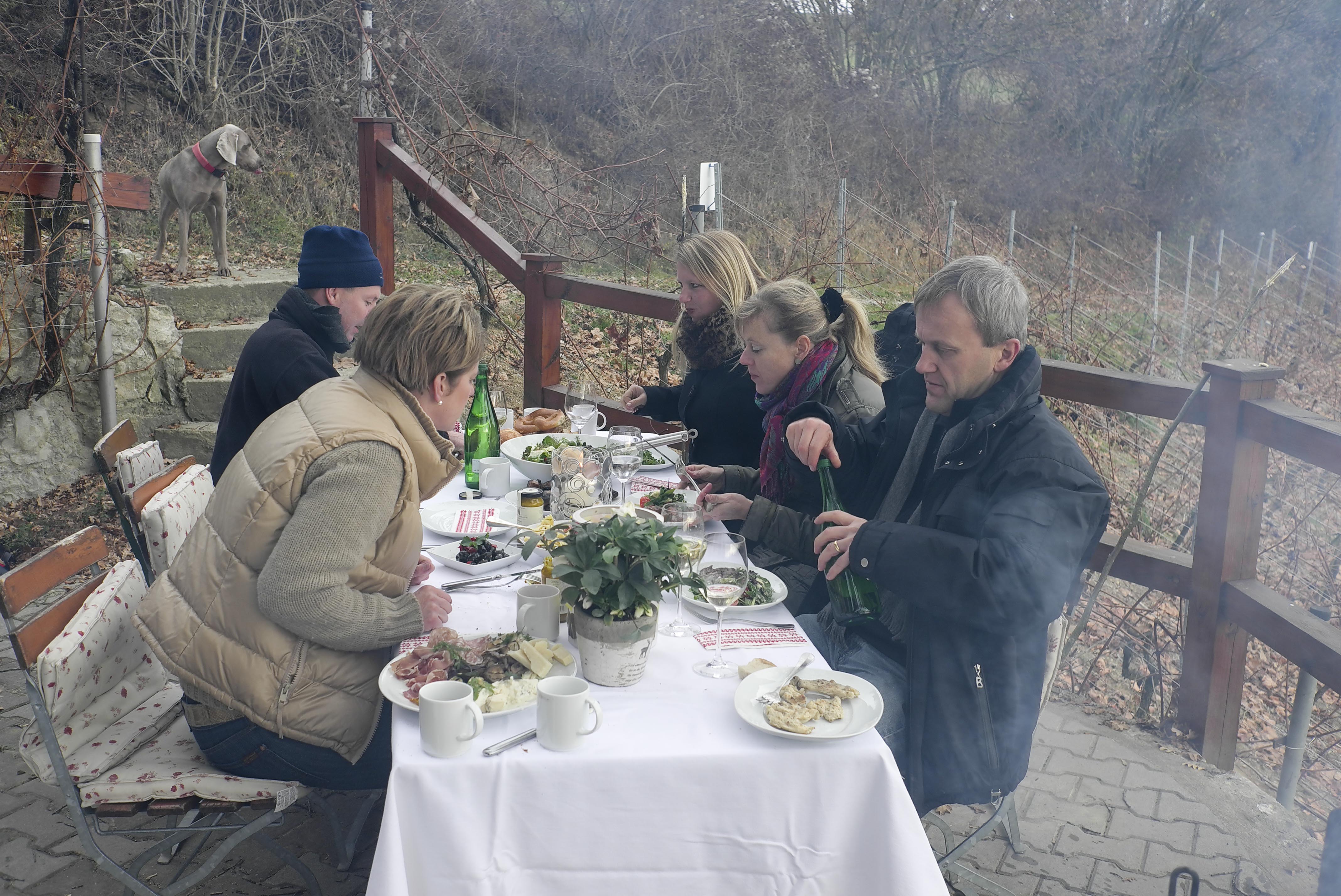 Vor dem Häuschen befindet sich eine Terrasse, die gleich noch einen wunderbaren Ausblick bietet. Es ist ein wirklich magischer Platz und es ist ein großartiges Gefühl, von dort oben seinen eigenen Weinberg zu betrachten. Gleichwohl wir drei richtig stolz auf unser Weinbau-Projekt sind und schon viele unserer Gäste dort hingeführt haben, werden die Rebanlagen heutzutage zumindest halbmechanisch bearbeitet und Werkzeug und Maschinen dazu aus dem Tal mitgebracht. Somit hat das Häckerhäusle seine eigentliche Funktion verloren. Es eignet sich zwar für vier bis sechs Personen um zu feiern, doch für eine regelmäßige Nutzung ist es zu klein, denn wir benötigen Platz für mindestens 15 Personen und die Terrasse bietet keinen Schutz vor Regen.