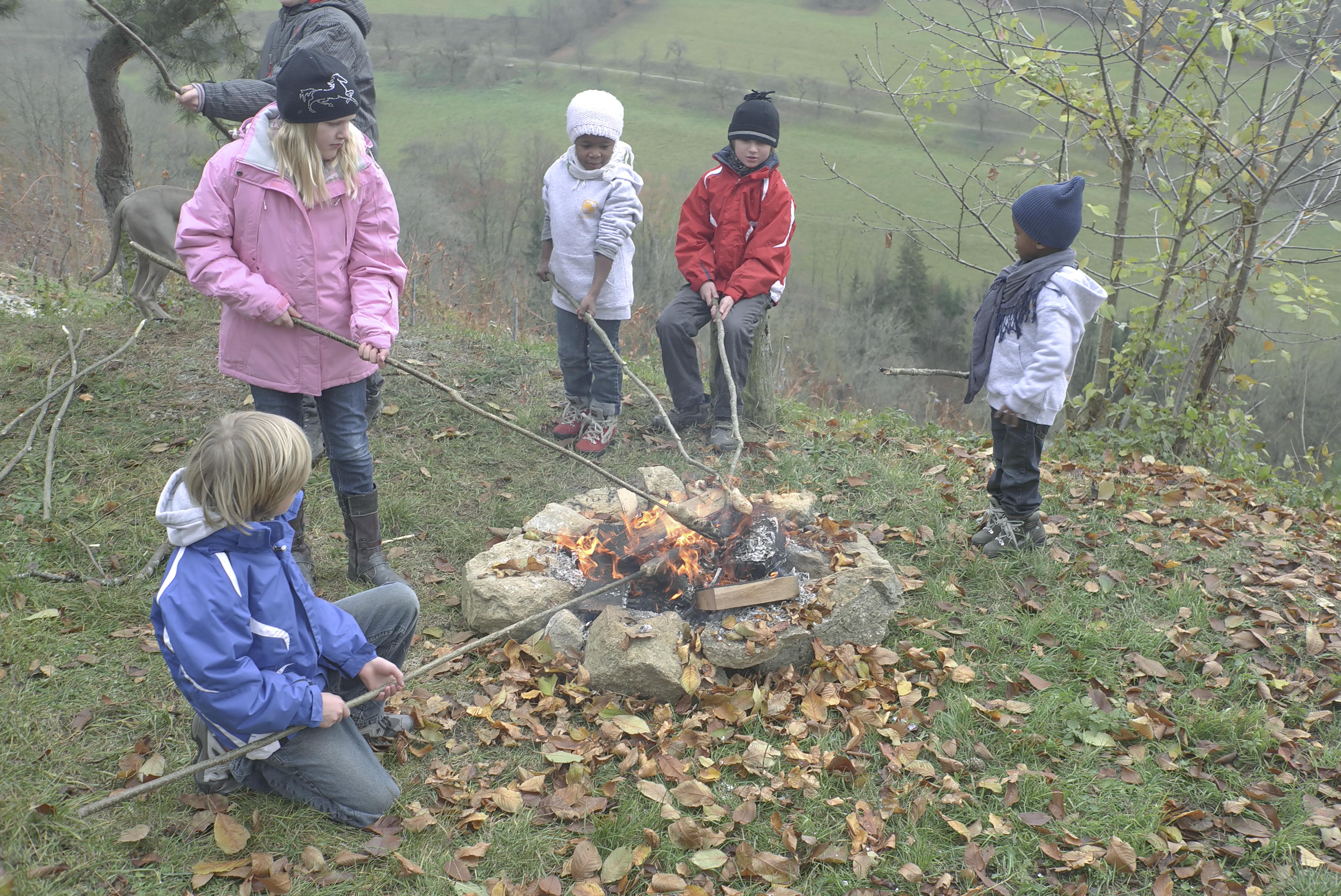 Als ob der Weinberg ein Wesen wäre, so ruht er nach geschafftem Werk in mystischer Stimmung. Diese friedliche, kontemplative, unwillkürlich den Puls senkende Umgebung will genossen sein. Und weil es bekanntlich kein falsches Wetter sondern nur falsche Kleidung gibt, war das trockene Wetter gut genug um zum Saison-Abschluss auf der Terrasse der Tauberhasen Ausheck-Hütte zu grillen. Bratwürste, Steaks und Ofenkartoffeln, dazu gab es Glühwein und Traubensaft-Punsch. Die Kinder konnten sich geschlagene fünf Stunden lang mit einem Feuer beschäftigen, das etwas abseits auf einem kleinen Hügel entfacht wurde. Laub verbrennen und Botzemockel ins Feuer schmeißen, Haselruten schnitzen und Stockbrot rösten waren genug Unterhaltung und Freude, sodaß sechs Kinder einen Tag ohne Marken-Spielzeug und Elektronik verbracht haben und abends müde und glücklich in ihre Betten gefallen sind.