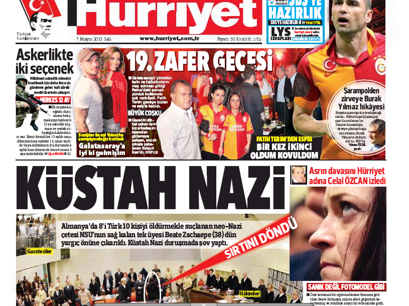 In der Türkei-Ausgabe der Hürriyet ist Beate Zschäpe am heutigen Dienstag auf der Titelseite. „Arroganter Nazi“, titelt die Zeitung.