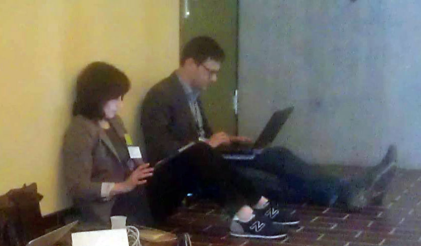 ZEIT-Reporterin Özlem Topcu schickte am Mittwoch folgendes Foto aus dem Sicherheitsbereich des Münchner Gerichts. Es zeigt sie in einer Verhandlungspause mit dem dpa-Journalisten Jochen Neumeyer – beide müssen wegen des Platzmangels auf dem Boden sitzend arbeiten.