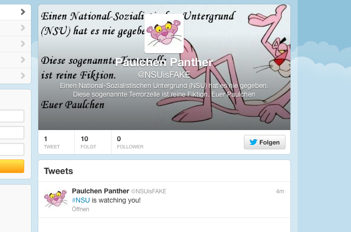 Nur geschmacklos, irre oder volksverhetzend? Am Dienstagabend startete ein Twitter-Account mit der kruden Behauptung – unter Anspielung auf die Holocaustlüge – den NSU habe es nie gegeben. Unter der – vom NSU-Bekennervideo bekannten – Paulchen-Panther-Figur ist vom „NSU-Märchen“ und von Medienlügen die Rede, Abgeordnete der Linkspartei werden diffamiert. Einer der Tweets warb für eine gleichnamige Facebook-Site. Über Nacht wuchs der Account auf 17 Postings an und war immer noch erreichbar.