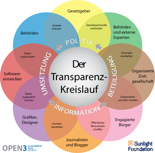 Denn wie schrieb die Foundation: „Eine offene Regierung ist eine tolle Sache, aber wir haben bislang keine. Was nun?“ Viele wollten sie ermöglichen, doch wüssten nicht wie. Im Zentrum der Idee stünden für Jedermann zugängliche Daten der Verwaltung, heißt es in dem Text. Die Grafik nun sei der Versuch, übersichtlich darzustellen, welche gesellschaftlichen Gruppen zusammenarbeiten müssten, damit das Ziel „transparente Regierung“ erreicht werden könne.