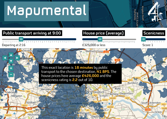Neben der Auskunft, wie weit ein Punkt von einem anderen entfernt ist, blendet Mapumental auch die durchschnittlichen Immobilienpreise einer Region ein. Auch wird versucht, eine Aussage zu treffen, wie „schön“ es an einem bestimmten Ort ist. Zu diesem Zweck wird auf die Informationen eines anderen Projekts von MySociety zurückgegriffen: 15.000 User haben bei ScenicOrNot anhand von Fotos aus verschiedenen Gegenden geurteilt, für wie landschaftlich reizvoll sie diese halten.