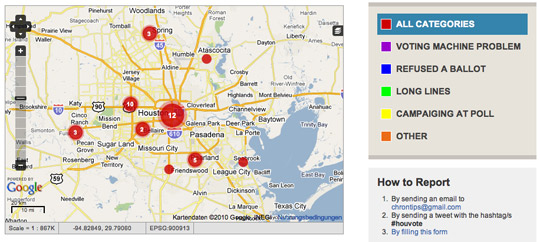 Die Zeitung Houston Chronicle setzte auf den Krisen-Kartierungsdienst Crowdmap, um Lesern zu ermöglichen, Probleme bei den Wahlen zu melden. Die scheinen sich allerdings zahlenmäßig in Grenzen gehalten zu haben.
