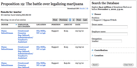 Dass Transparenz und OpenData, sobald es um den Bereich persönlicher Daten geht, auch problematisch sein kann, zeigt ein Angebot des DataDesk der L.A.Times. Dort lässt sich nachschlagen, wer mit einer Spende die „Proposition 19„, den Vorschlag zur Legalisierung von Cannabis in Kalifornien unterstützt hat. So lässt sich beispielsweise nach dem Beruf „Teacher“ suchen.