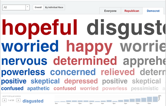 Auch eine zweite Anwendung der New York Times ist sehenswert: „What’s on your mind?“ fragt, welches Wort den Zustand der Users gerade am besten beschreibt – es können eigene Begriffe eingeben oder aus Vorgaben gewählt werden. Aus diesen Angaben wird dann animiert die aktuelle Stimmunglage dargestellt. Allgemein, oder getrennt nach Republikanern und Demokraten.