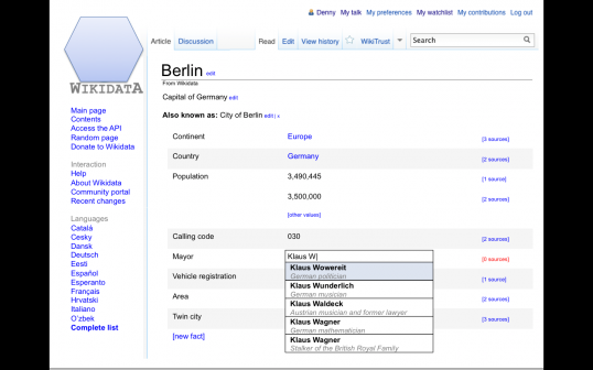 Die Einwohnerzahl von Berlin ändert sich ständig. Jedes Jahr, wenn die neuen Zahlen veröffentlicht werden, setzt sich ein Wikipedia-Autor an den Eintrag über Berlin und aktualisiert ihn. Allerdings müsste die Zahl in jeder Ausgabe der Wikipedia von Hand geändert werden, von der englischen bis zur turkmenischen. Das soll anders werden, sagt Pavel Richter, Vorstand des Vereins Wikimedia Deutschland.