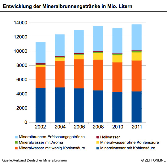 Besonders beliebt sind Mineralwässer mit wenig Kohlensäure und stille Wässer ohne und mit Geschmack. Ihr Absatz hat in den vergangenen Jahren stark zugenommen, während der Verkauf von Sprudelwasser hingegen leicht sank. Auch Erfrischungsgetränke auf Mineralwasserbasis verkaufen sich gut. Fassbrause sei der neue Trend, sagt der Mineralwasserverband, obwohl sie „eigentlich auf eine lange regionale Tradition zurückblicken“ könne.