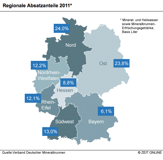 Den Branchenvertretern zufolge gibt es in Deutschland über 500 verschiedene Mineralwässer aus regionalen Brunnen. Die Karte zeigt: Ein beträchtlicher Teil der Wässer wird auch regional vermarktet. Besonders hoch ist die Quote in Nord- und Ostdeutschland. Allerdings ist die Größe der vom Branchenverband ausgewiesenen Gebiete sehr unterschiedlich, und gerade der Norden und Osten fallen besonders groß aus. Gut möglich, dass unter den dort gehandelten und in der Statistik als „regional“ ausgewiesenen Mineralwässern auch solche sind, die über weite Strecken transportiert werden – beispielsweise von Südthüringen nach Berlin. Auffällig ist dennoch, dass ausgerechnet Bayern als relativ großes Flächenland den geringsten Absatzanteil an regionalen Wässern aufweist.