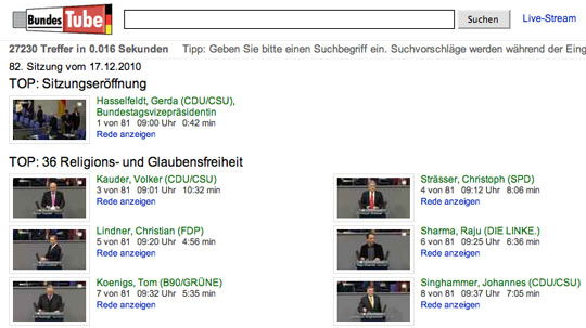 Dank opengovernment.org lässt sich der aktuelle Stand der Gesetzgebung nachvollziehen und in verschiedene Zusammenhänge setzen. So können Gesetzentwürfe chronologisch oder nach Themen durchsucht werden. Angezeigt werden auch Informationen über die daran beteiligten Politiker: Neben deren Biographien und ihrem bisherigen Abstimmungsverhalten findet die Suche ihre Namen auch in sozialen Netzwerken, Blogs et cetera. Gleichzeitig ist sichtbar, wer Geld an die Mandatsträger spendete – etwa die Tabaklobby in Texas.