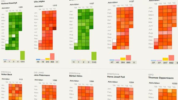 Mithilfe der Oberkategorien erstellte Infografiker Paul Blickle ein visuelles Konzept zur Aufarbeitung des Datenwusts. Jeder Tätigkeitskategorie wurde eine Farbe zugeordnet und für jeden Abgeordneten eine farbliche Übersicht angefertigt. Sichtbar ist nun ein Kalender mit gefärbten Kästchen für jeden Monat der 17. Legislaturperiode.