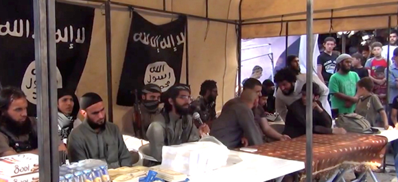 Auf den Tischen vor den Männern stehen Getränke und Kekspackungen – in der islamischen Welt, also auch in Syrien, wird gerade der Fastenmonat Ramadan begangen, es scheint also, als ob die Terroristen zum Fastenbrechen am Abend eingeladen haben.
