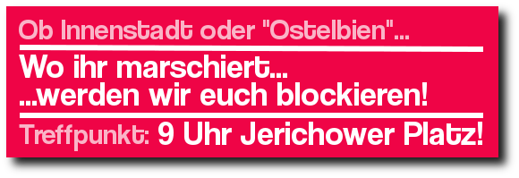 Schon jetzt scheint klar: einen Aufmarsch in der Innenstadt wird es nicht geben. Wir haben damit ein Zwischenziel erreicht! Unsere bundesweite und höchst erfolgreiche Mobilisierung zwingt die Polizei dazu, die Naziroute in einen peripheren Stadtteil zu verlegen. Dennoch betonen wir: wir blockieren jeden Naziaufmarsch, egal ob im Stadtzentrum oder in Randbezirken. Geschichtsrevisionismus, Rassismus und völkisch-neonationalisozialistische Hetze sind an jedem Ort fehl am Platz. Aus diesem Grund versprechen wir: wir sind auf jedes Szenario bestens vorbereitet.