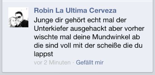 Facebook oder die Band selbst haben während der Nacht eine ganze Reihe der härtesten Kommentare gelöscht. Auf den ersten Blick unpolitische Frei.Wild-Fans bepöbelten die Band und Unterstützer ihrer Haltung mit Heil-Hitler-Parolen, forderten „Nazis rein“ und sprachen Todesdrohungen aus. Dass auch die von Rechtsextremen durchsetzte „Identitäre Bewegung“ sich in dem Thread äußerte, zeigt, wie nah die sogenannte Mitte und Neonazis sich im Umfeld von Frei.Wild bewegen.Wer sich in den Kommentaren als Frei.Wild-Kritiker zu erkennen gibt, dem wird offen mit Gewalt gedroht. „Junge, dir gehört echt mal der Unterkiefer ausgehackt“ und ähnliches war dort zu lesen.