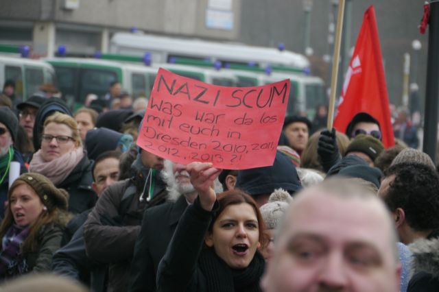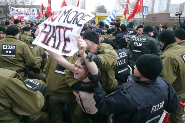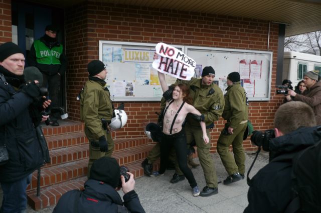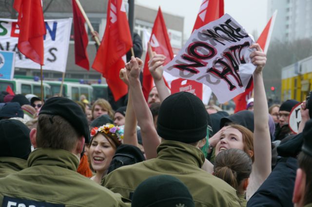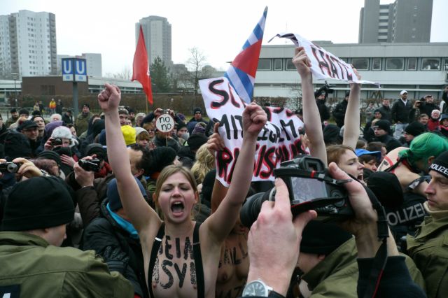 Währenddessen hatten sich vor dem Gemeinschaftshaus hunderte Antifaschist_innen versammelt und laut und vielfältig gegen das Treffen der braunen Kamerad_innen demonstriert. Neben Parteien und deren Jugendorganisationen waren auch Nachbarschaftsinitiativen und Flüchtlingsgruppen dem Aufruf gefolgt. Besonderes Aufsehen erregten die Aktivistinnen der Frauenrechtsgruppe Femen. Diese sind dafür bekannt, dass sie sich ihre politischen Forderungen auf die Oberkörper schreiben und dementsprechend leicht bekleidet auftreten. Sie überwanden mehrmals die Absperrgitter, welche die NPD’ler von ihren Gegner_innen trennten.