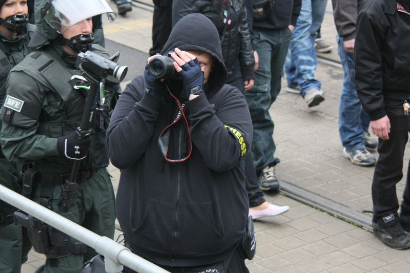 Doch nicht nur das Ablichten von politischen Gegnern zählt zur Aufgabe der rechtsextremen Fotografen. Diese schüchtern auch gezielt Journalisten ein und versuchen deren Film- und Fotoaufnahmen durch herumschubsen, vor die Kamera stellen oder schlicht und einfach subtile Bedrohungen zu verhindern. Besonders deutlich wurde diese Strategie im Vorfeld des neonazistischen 1. Mai des „Freien Netzes Süd“. Bei der Propagandatour anlässlich des jährlichen Aufmarsches, der dieses Jahr in Würzburg stattgefunden hat, grenzten sich bekannte Anti-Antifa-Fotografen bewusst von den „Kameraden“ im uniformierten 1. Mai-T-Shirt ab und hielten eine bestimmte Distanz zu den anderen rechtsextremen Veranstaltungsteilnehmern ein. Ausgestattet mit professionellen Kameras und Objektiven konnten sie so anwesende Gegendemonstranten fotografieren.