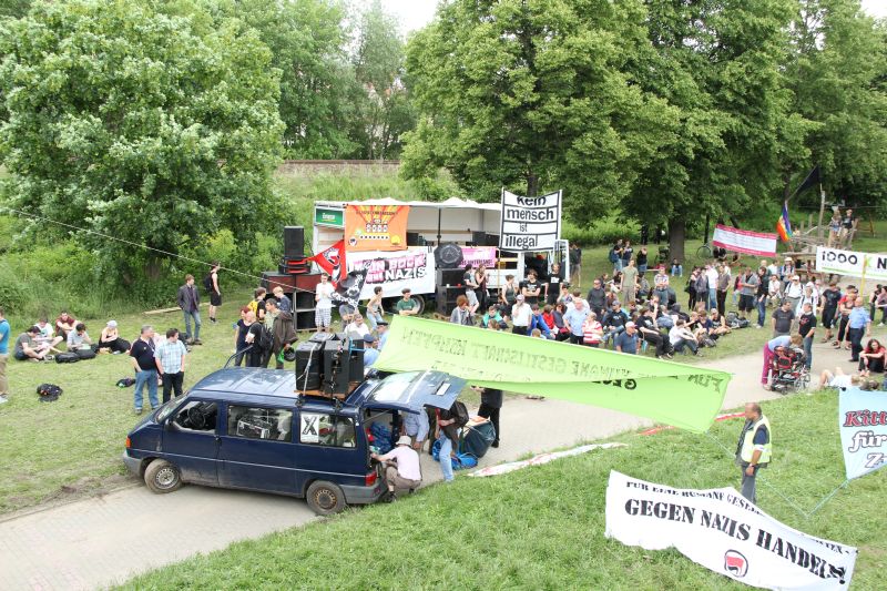 Bereits vor dem Beginn der Rechtsrock-Veranstaltung versuchten Gegendemonstranten die Zufahrtswege mit Blockaden zu schließen. Insgesamt kamen rund 550 Menschen zu den verschiedenen Veranstaltungen, die eine klare Botschaft hatten: Neonazis sind hier nicht willkommen. Auch die JG-Stadtmitte war mit ihrem „Lauti“ bei den Protesten vertreten. Bereits in der Nacht zuvor waren zwei Reifen des Busses zerstochen wurden. In einer Erklärung der JG heißt es: „Dieser Versuch zeigt erneut, dass die Thüringer Neonaziszene nicht nur in der Solidarisierung mit dem NSU aktiv ist, sondern auch nicht vor Übergriffen zur Verhinderung antifaschistischen Protest zurückschreckt.“ Doch die Reifen konnten schnell ersetzt werden und wurden durch Spenden auch finanziell getragen.