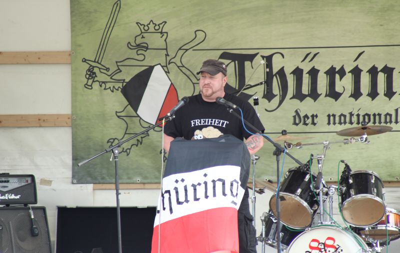 Die Ausrichtung der Veranstaltung war mehr als deutlich: Solidarität mit dem mutmaßlichen NSU-Unterstützer Ralf Wohlleben. Zahlreiche Neonazis trugen die in der Szene populären Unterstützer-T-Shirts mit der Aufschrift „Freiheit für Wolle“. Auch das große Banner des „Thüringer Heimatschutzes“ prangte wie ein Bekenntnis zu den inhaftierten Neonazis in der Mitte des Veranstaltungsgeländes. So verwunderte es kaum, dass die beiden ersten Redner immer wieder Bezug auf den in Haft befindlichen Wohlleben nahmen; die distanzierende Haltung der NPD zum ehemaligen Parteifunktionär kritiserten die Neonazis scharf. Bei den zahlreichen anwesenden NPD-Funktionären dürfte die Nachricht mehr als deutlich angekommen sein. Im Hinblick auf die anstehende Bundestagswahl sollte die NPD ohnehin um ein gutes Verhältnis zu den neonazistischen „Freien Kräften“ bemüht sein – Plakate hängen sich schließlich nicht von allein.